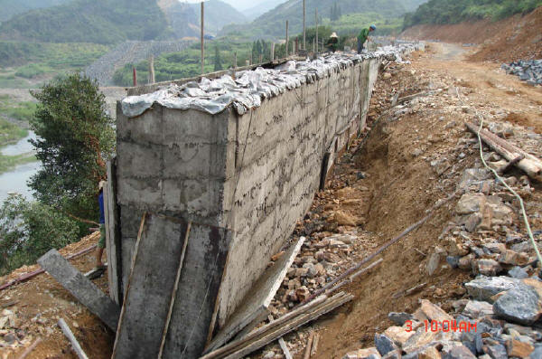 擋墻砌筑應(yīng)分層,每一砌筑層擺石時均應(yīng)座漿,隨鋪漿隨砌筑。嚴(yán)禁石塊大面無漿直接貼靠?;炷帘仨氂谜駬v器逐縫振搗。當(dāng)豎縫寬度在5cm以上時,可填漿后塞片石。嚴(yán)禁先堆砌石塊再用膠結(jié)料灌縫。
