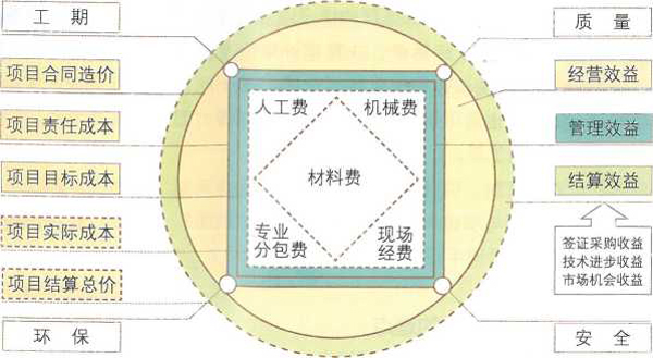 的關(guān)系?!敖禹?xiàng)目”確定了合同造價(jià),對(duì)應(yīng)方圓圖的實(shí)線圓;“做項(xiàng)目”的第一步是下達(dá)項(xiàng)目目標(biāo)責(zé)任書,確定項(xiàng)目責(zé)任成本,對(duì)應(yīng)方圓圖的責(zé)任成本方形,第二步分子公司在責(zé)任書的基礎(chǔ)上進(jìn)行項(xiàng)目實(shí)施策劃,產(chǎn)生項(xiàng)目的目標(biāo)成本,對(duì)應(yīng)方圓圖的目標(biāo)成本方形,第三步就是項(xiàng)目實(shí)施過程的管控,最終確定實(shí)際成本,對(duì)應(yīng)方圓圖的實(shí)際成本方形?!八阗~收錢”就是完成項(xiàng)目過程中的結(jié)算變更與最后的決算收款,從而確定結(jié)算造價(jià),對(duì)應(yīng)方圓圖的結(jié)夢(mèng)造價(jià)虛線圓。項(xiàng)目實(shí)施過程中進(jìn)度、質(zhì)量、安全、環(huán)保及周邊相關(guān) 方的管理對(duì)應(yīng)成本方形的四個(gè)支撐頂點(diǎn),構(gòu)成成本的五項(xiàng)費(fèi)用“材料、人工、機(jī)械、現(xiàn)場(chǎng)經(jīng)費(fèi)、專業(yè)分包”對(duì)應(yīng)成本方形的內(nèi)部區(qū)域。