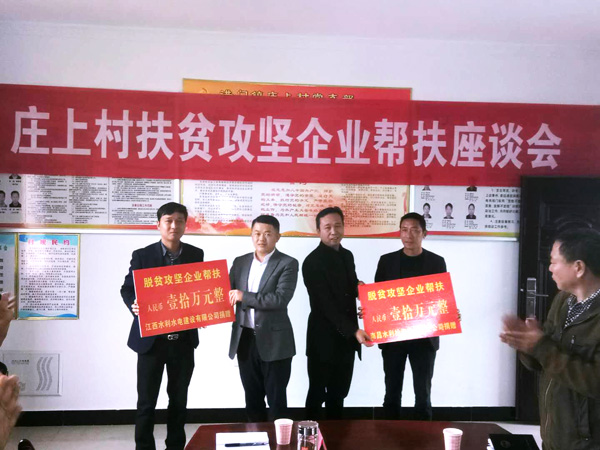 為認(rèn)真貫徹落實(shí)黨的十九大關(guān)于堅(jiān)決打贏脫貧攻堅(jiān)戰(zhàn)的新部署新要求,踐行企業(yè)的社會責(zé)任。11月17日,公司副總經(jīng)理王俊華同志率撫州廖坊灌區(qū)二期工程施工總部負(fù)責(zé)人胡福民、項(xiàng)目財(cái)務(wù)部負(fù)責(zé)人肖志兵代表江西省水利水電建設(shè)有限公司前往南城縣洪門鎮(zhèn)參加莊上村扶貧攻堅(jiān)企業(yè)幫扶座談會,并將公司捐助的10萬元扶貧資金送至莊上村村委會。