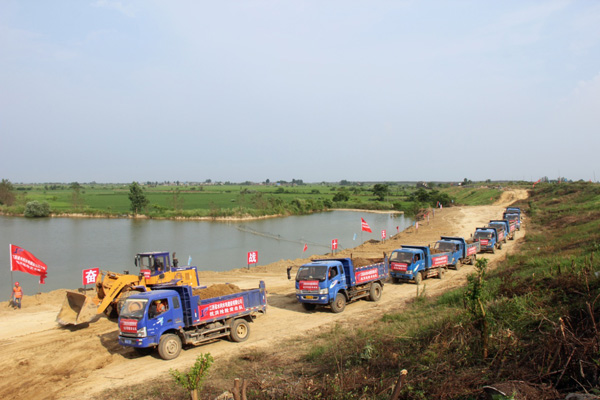 受前期連續(xù)強(qiáng)降雨及長江洪水倒灌、頂托影響,九江市河湖水位長時(shí)間處于超警戒水位狀態(tài),導(dǎo)致該地區(qū)防汛形勢十分嚴(yán)峻,圩堤險(xiǎn)情隨時(shí)可能發(fā)生,特別是堤腳處有池塘的圩堤更易出現(xiàn)險(xiǎn)情。為確保廬山市沙湖山圩堤長期穩(wěn)固,我司在接到該市防汛指揮部的除險(xiǎn)加固任務(wù)后,立即派遣抗洪搶險(xiǎn)突擊隊(duì)前往現(xiàn)場進(jìn)行搶險(xiǎn),以穩(wěn)固圩堤,確保圩堤內(nèi)村莊百姓及農(nóng)田安全。經(jīng)過現(xiàn)場勘查,突擊隊(duì)決定沿著圩堤腳有池塘的地段填出一條長約1公里、寬20米的壓浸平臺(tái)進(jìn)行加固處理。搶險(xiǎn)方案確定后,公司迅速組織了3臺(tái)挖掘機(jī)、2臺(tái)裝載機(jī)、36臺(tái)自卸汽車等機(jī)械設(shè)備及40多名作業(yè)人員頂著炎炎烈日進(jìn)行施工,力求在10天內(nèi)完成搶險(xiǎn)任務(wù),確保圩堤安全。